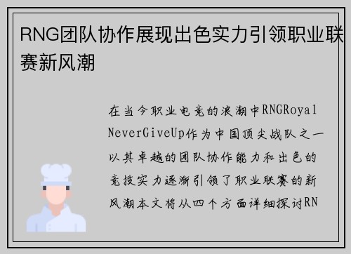 RNG团队协作展现出色实力引领职业联赛新风潮