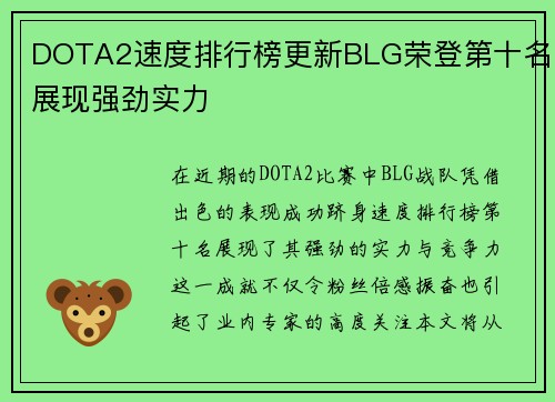 DOTA2速度排行榜更新BLG荣登第十名展现强劲实力