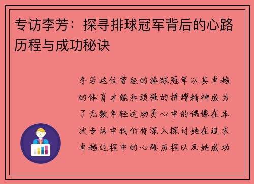 专访李芳:探寻排球冠军背后的心路历程与成功秘诀